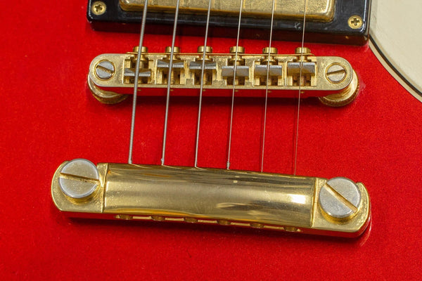 Body condition: There are signs of overall use, with burnt seals on the top of the body, dullness of the gold parts, rust, and peeling of the mech. There are many scratches on the pickguard, many scratches on the escutcheon, dents on the top of the headstock on the third string side, three dents on the neck, and a large dent on the cutaway section.