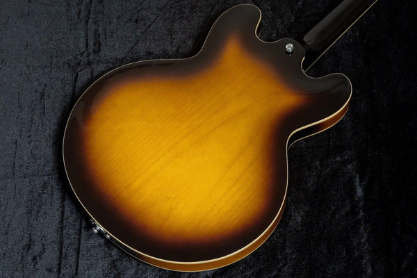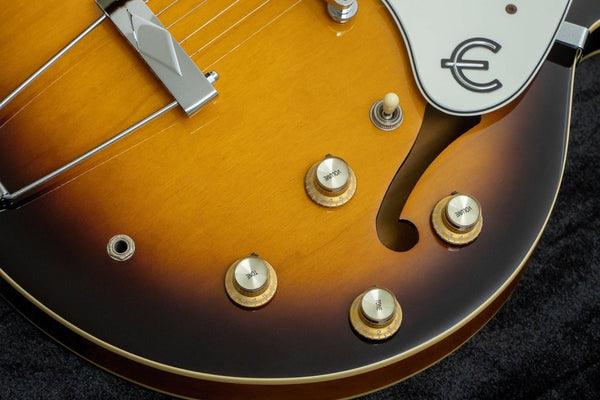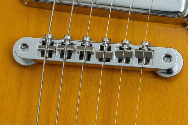 The body and finish are in good condition; there are numerous scratches near the top cutaway. There are faint scratches on the sides and back of the body, some playing marks on the pickguard, and a 2mm dent on the back of the body. There are scratches and rust on the metal parts. The paint is cloudy at the joint and headstock. There is a dent on the headstock.
