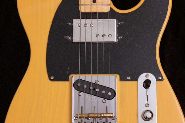 The guitar is equipped with a Wide-Range CuNiFe Humbucking pickup in the neck position and a Custom Shop Texas Special Tele Pickup in the bridge position.