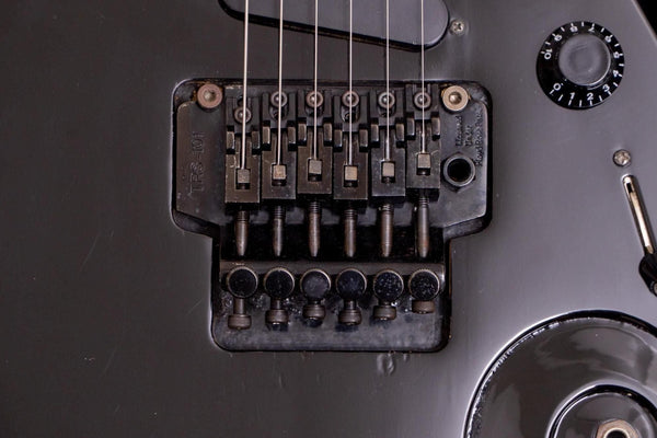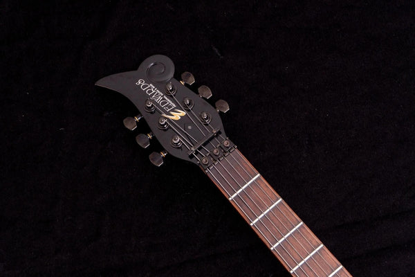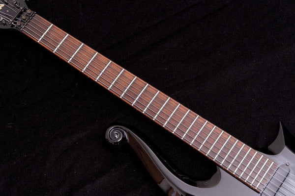 The guitar's unique design is unified in black, from the body, neck, headstock, and other components, giving it a cool look.