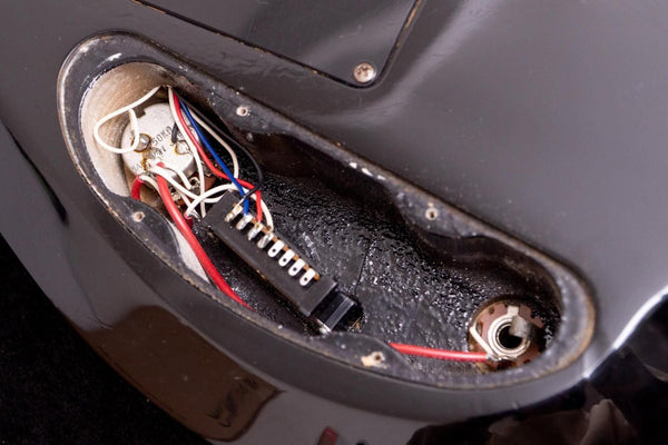 Body condition: There is paint chipping on the back of the headstock. There is paint chipping near the cutaway. There are many scratches and signs of use throughout the body and neck. There is dullness on the metal parts.