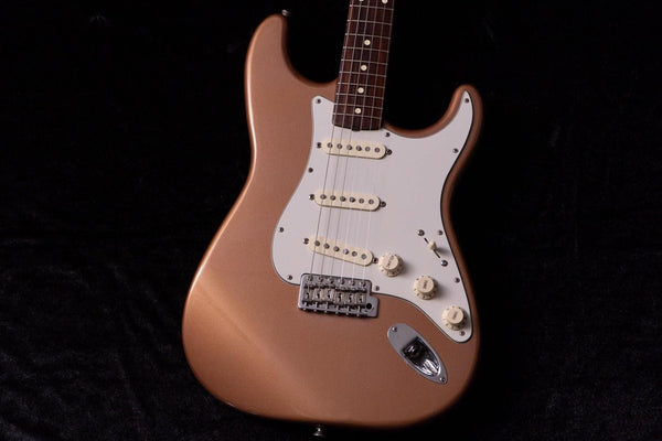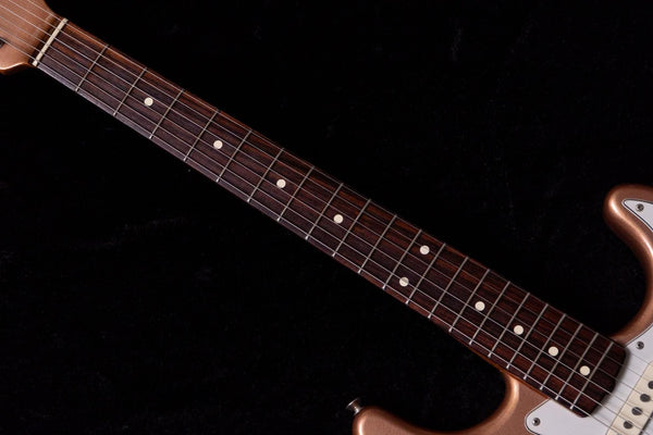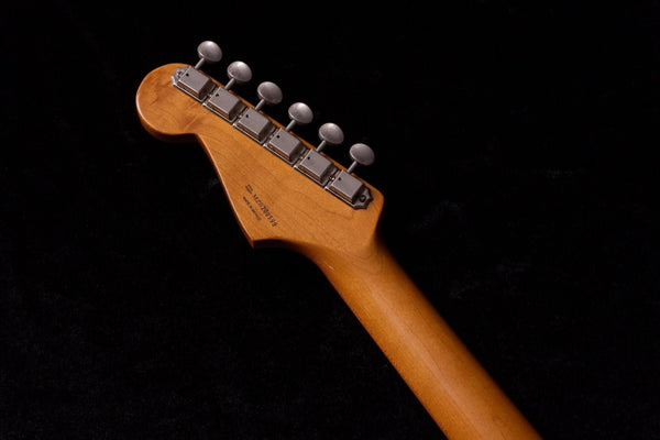 The bridge saddle and tremolo springs have been replaced with Raw Vintage ones, and the neck plate is replaced with an FCGR one.