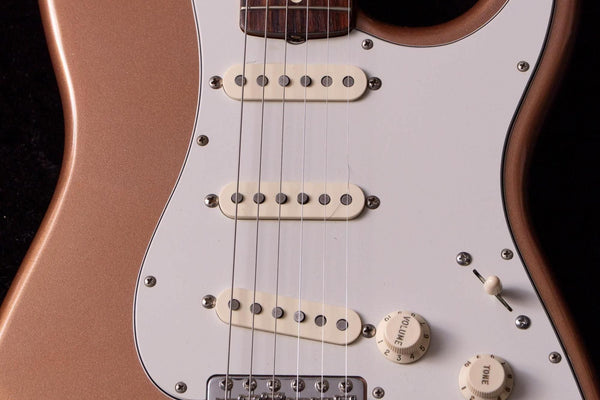 Its traditional styling includes a C-shaped neck, a 7.25-inch fingerboard radius, and a six-point tremolo bridge.