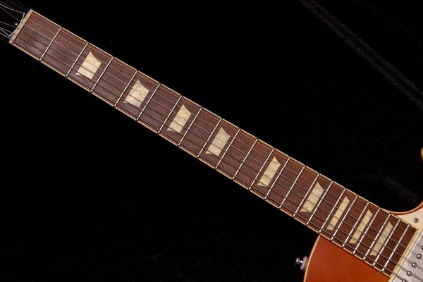 The body and finish have some wear: the pickup cover is dull, there is a scratch on the cutaway area of the top of the body near the first string, there are numerous scratches on the sides of the body, and there are scratches, dents, and chips on the back of the body.