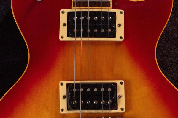 The body and paint show signs of age-appropriate wear, with scratches, dents, tarnished metal parts, rust, and dull paint. The paint on the back of the neck is peeling. There is a dent on the back of the neck. There is a large dent on the back of the body. There are numerous scratches on the control panel, scratches on the pickup, discoloration and cracks in the body binding, and discoloration on the neck binding.
