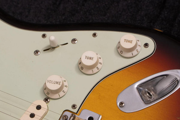 The body and finish have been relic-finished, making it difficult to accurately determine the condition. There are scratches on the side of the body near the first string and near the spring cover on the back of the body that are difficult to determine if they are relic-finished, dents on the 5th and 6th frets on the back, and a linear scratch near the logo on the back of the headstock.