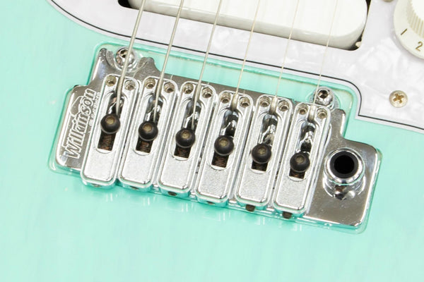 The hardware is equipped with Gotoh Magnum Locking tuning machines and a two-point Wilkinson tremolo bridge, providing a complete range of specifications.