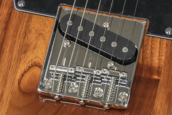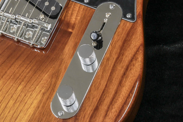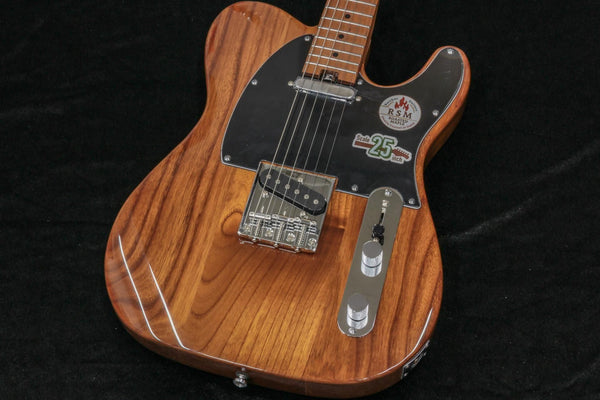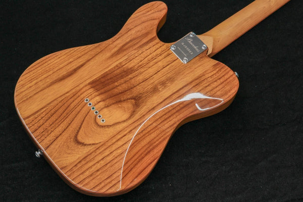 The guitar features a Telecaster shape with back and elbow cuts for playability.