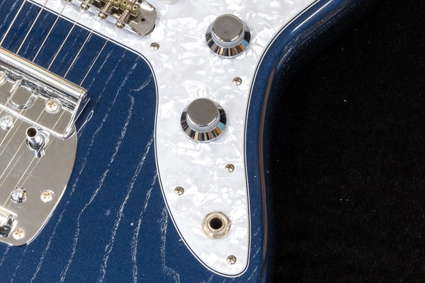 A white pearlescent pickguard is mounted on a beautiful Moire Gunjyo-colored light ash body.