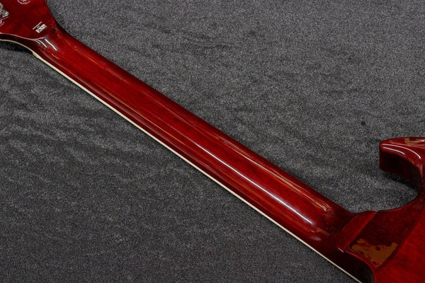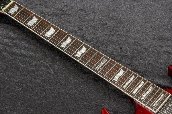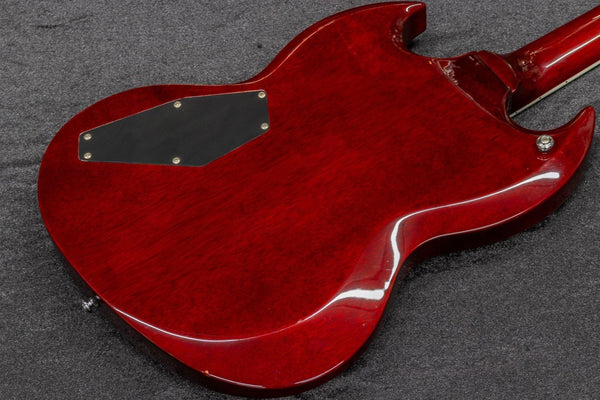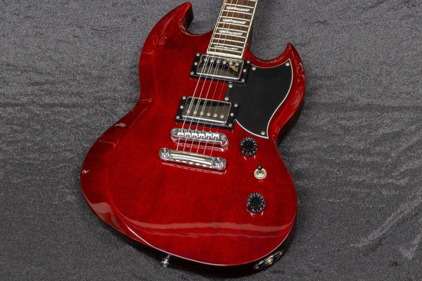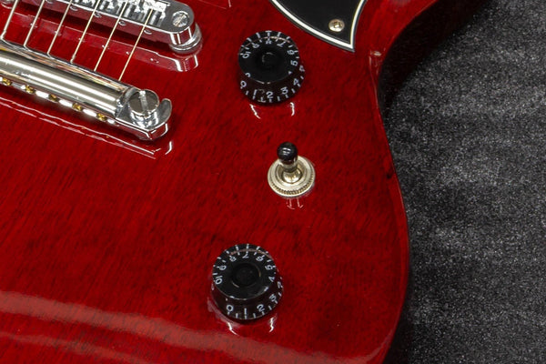 While it looks similar to a Gibson SG, its asymmetrical horns, controls, and 24 frets give it a unique touch.