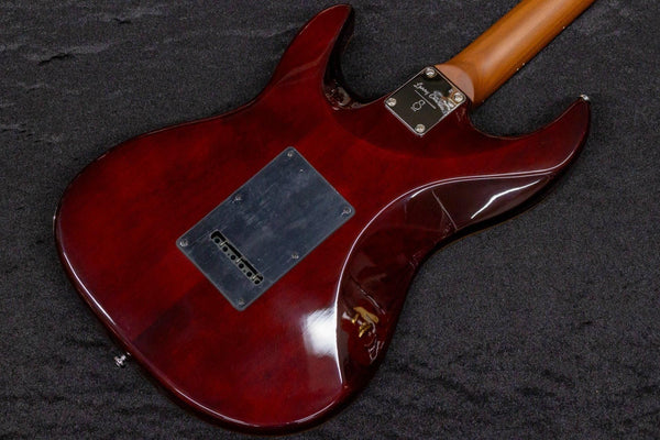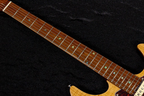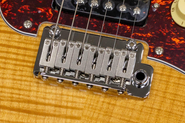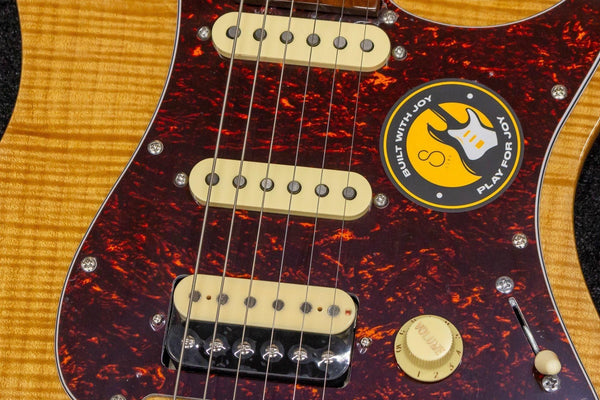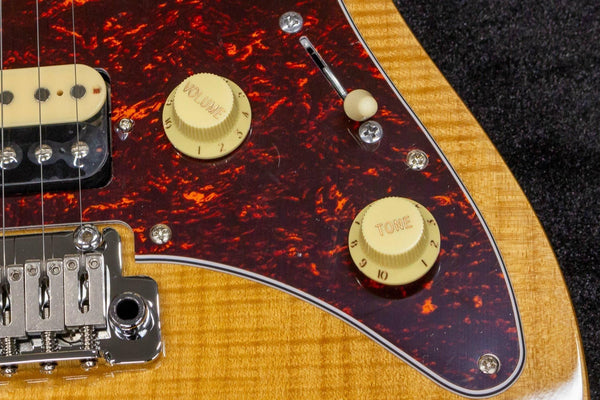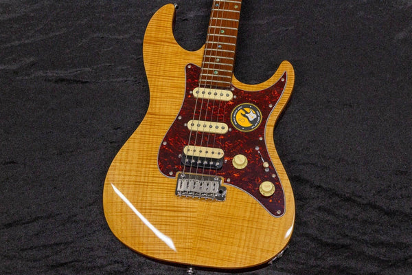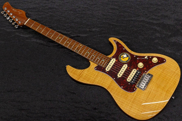 The beautiful flame maple body top and SSH pickup arrangement suggest a modern design.