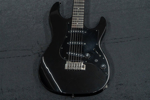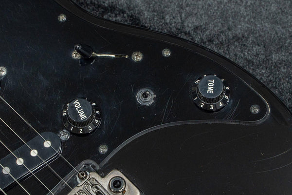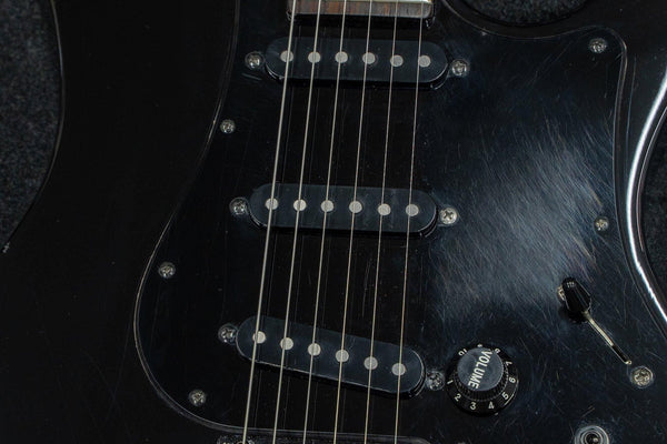 The body and finish are in good condition; due to the black finish, many small scratches are visible. There are also many scratches from playing on the pickguard. There is rust on the metal parts.