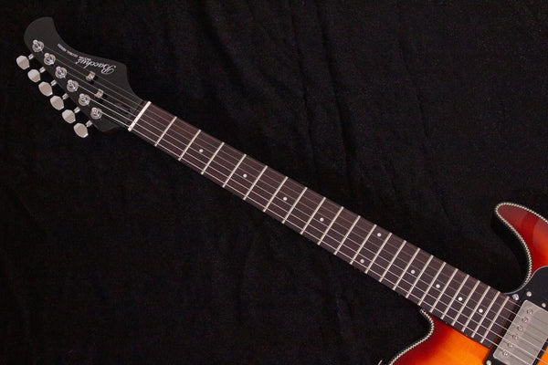 This is a new Bacchus product with the unique specifications of a Telecaster shape, archtop, and Thinline construction.