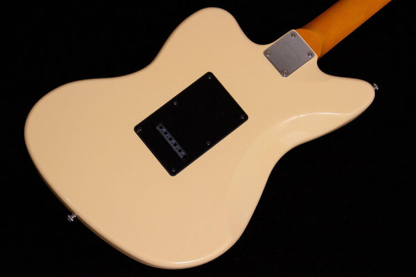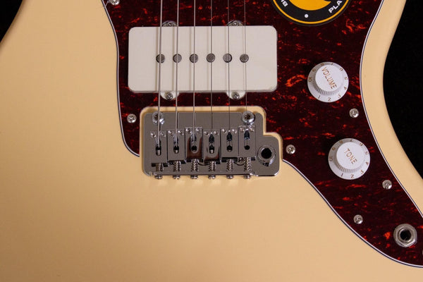 It also features a two-point tremolo bridge and a three-way toggle switch, giving it somewhat modern elements.