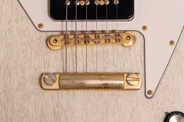 With a unique body design and headshape, a uniform white color scheme for the body, neck, and headstock, and gold hardware, this guitar has a unique and original look.