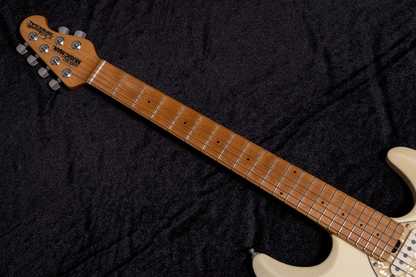 It features specifications unique to the Music Man, such as an original body design, pickguard, 4:2 tuning machine configuration, and a small headshape.