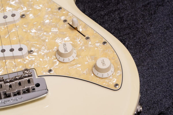 The tuning machines are Schaller locking, and the bridge is an original two-point support tremolo, combining smooth arm action with stable tuning.