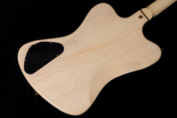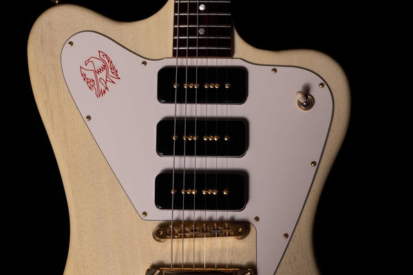 With a unique body design and headshape, a uniform white color scheme for the body, neck, and headstock, and gold hardware, this guitar has a unique and original look.