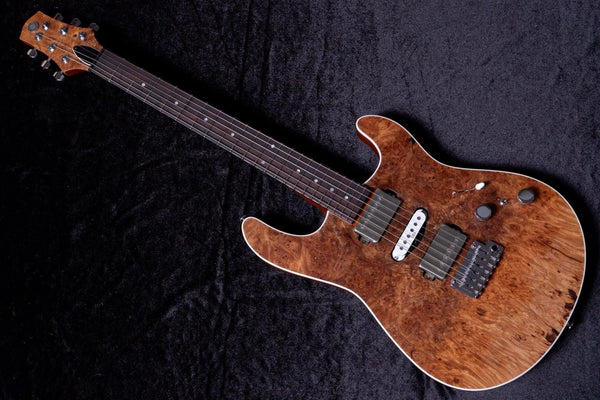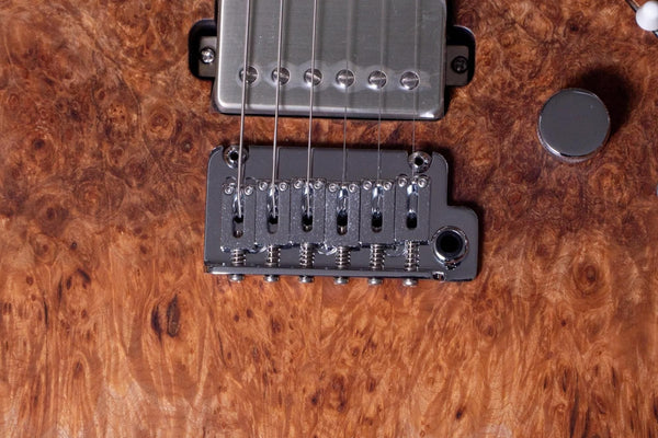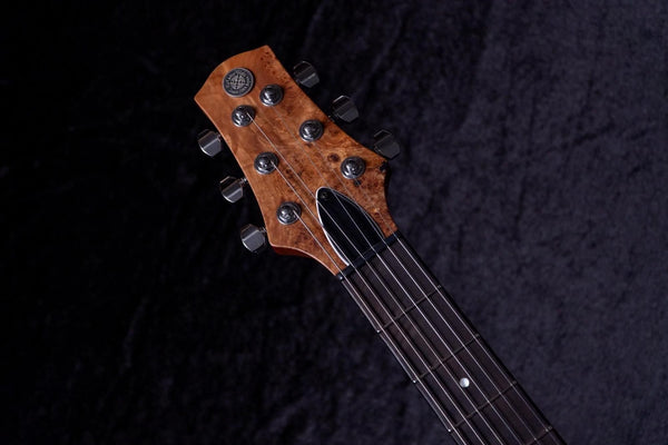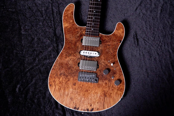 The body back is made of chambered Honduras Mahogany, and the top is made of beautiful, undulating burled maple.