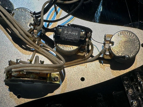 The body and paint show some light scratches when held up to the light, but there is no major damage and it is in excellent condition. There is some tarnish on the metal parts. The pickguard film remains. There is a scratch around the string post for the 4th string.