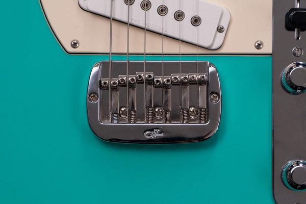 The body color is finished in Belair Green, and combined with the large pickguard, it has a pop and original look.