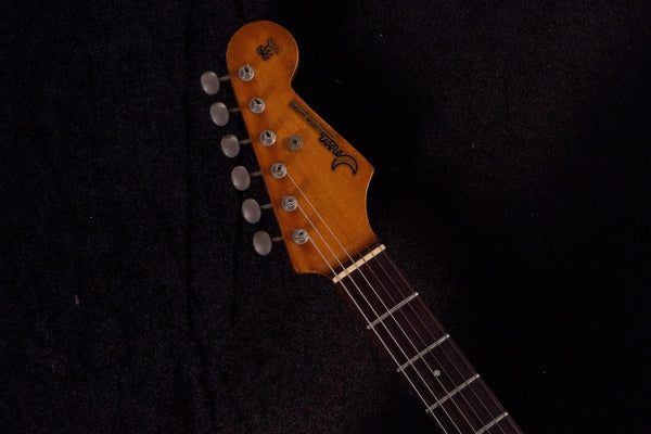The body and finish show signs of aging, including fading on the pickguard, sun damage throughout, rust and tarnish on the metal parts, and dents and scratches throughout the body and neck.