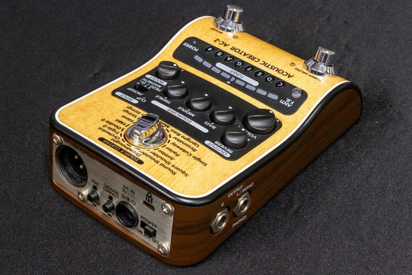 It features an "Acoustic Remodeling" function that recreates the natural body resonance of an acoustic guitar, which is lost when sound passes through a pickup, and a DI function.
