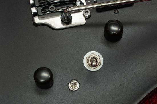 The electronics are simple, controlling the two humbuckers with volume, tone, pickup selector, and tap switch.