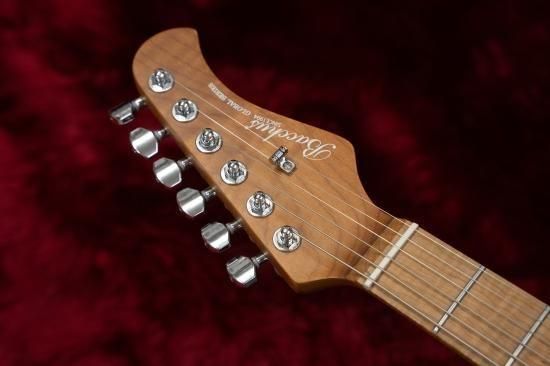The bridge is a Wilkinson, the nut is a Graphtech TUSQ XL, the tuning machines are locking, and the frets are stainless steel, making it a carefully crafted instrument.