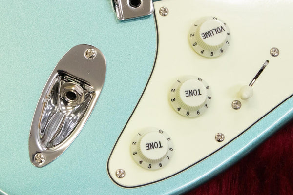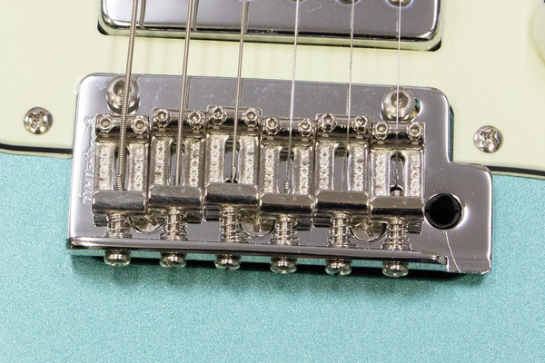 The pickups are a modern style, with the traditional triple single bridge pickup replaced with a humbucking type.