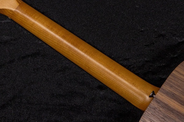 The back is walnut, the neck is maple, and the fingerboard is ebony.