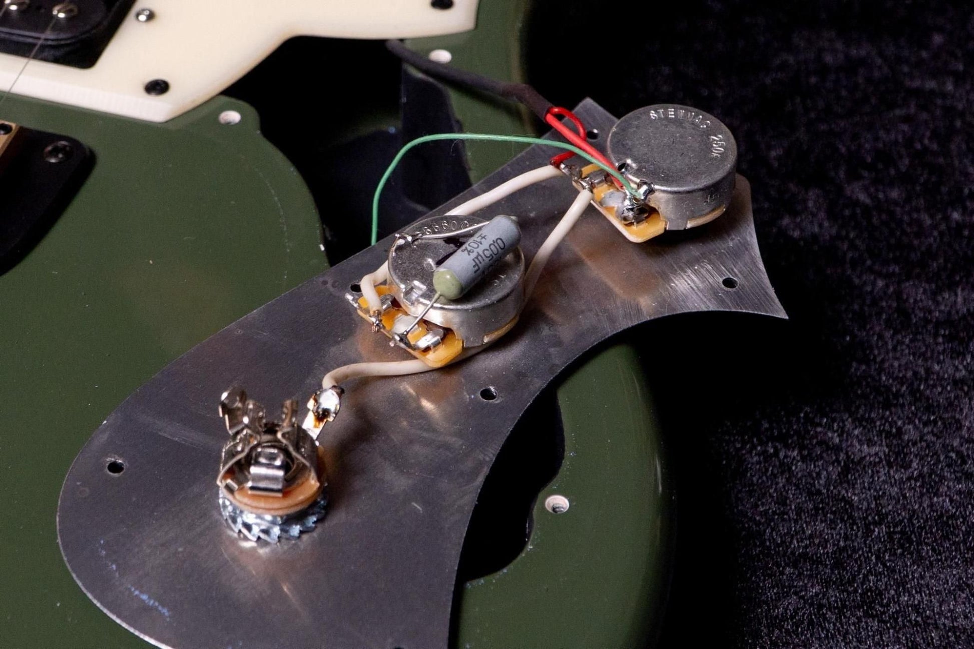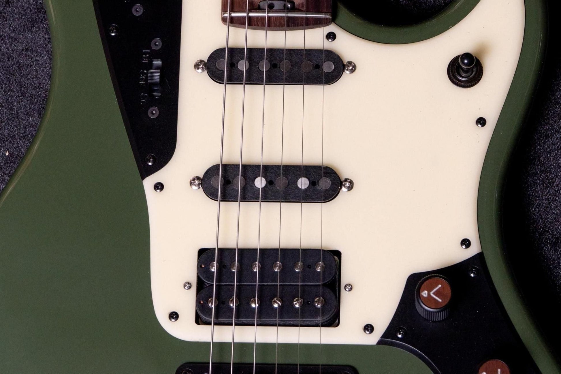 The olive body color, acrylic pickguard, duralumin fins, and matching headstock combine to create a cool look.