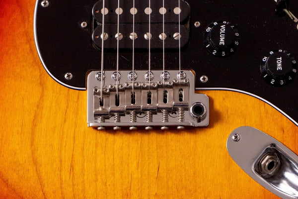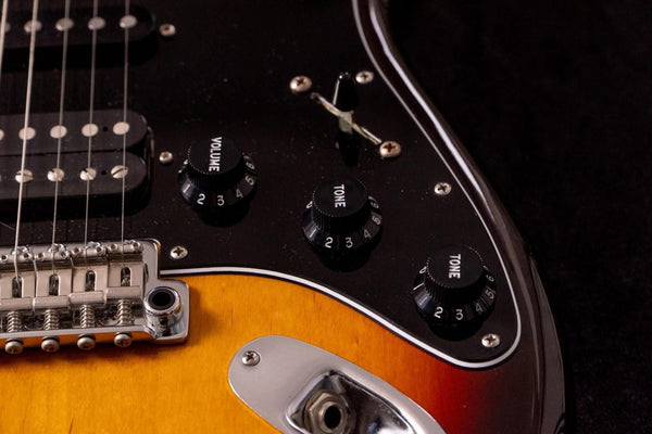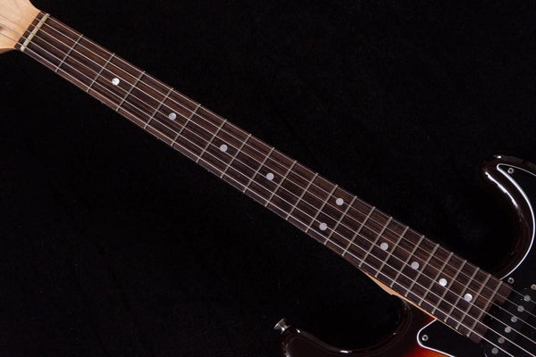 The three-tone sunburst body color matches the unified black parts, giving this guitar a chic look.