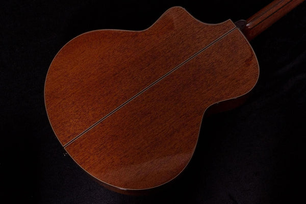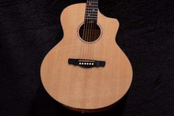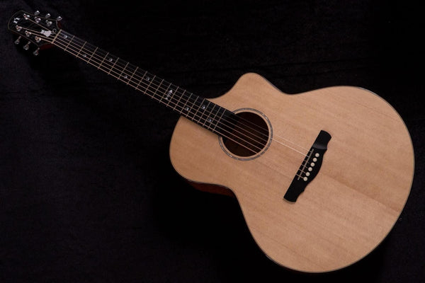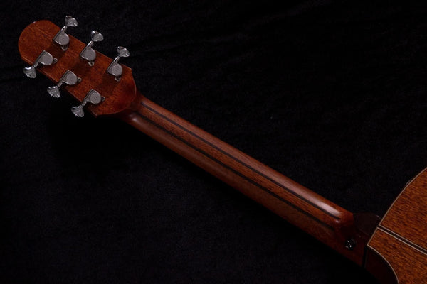The top is made of solid Sitka spruce, the back is solid mahogany, and the sides are laminated mahogany.