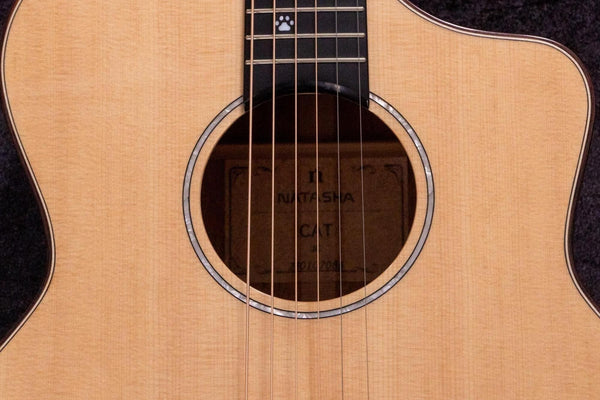 The headstock and fingerboard feature inlays with a cat paw print motif, giving this guitar a unique look.