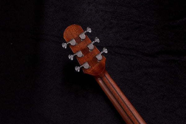 The neck is a five-piece construction of mahogany and HPL ebony, and the fingerboard is HPL ebony.