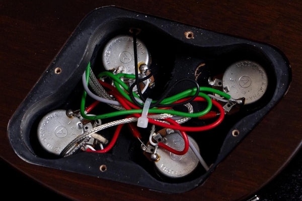 Controls include two volume controls, two tone controls, and a three-way toggle switch.