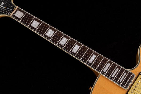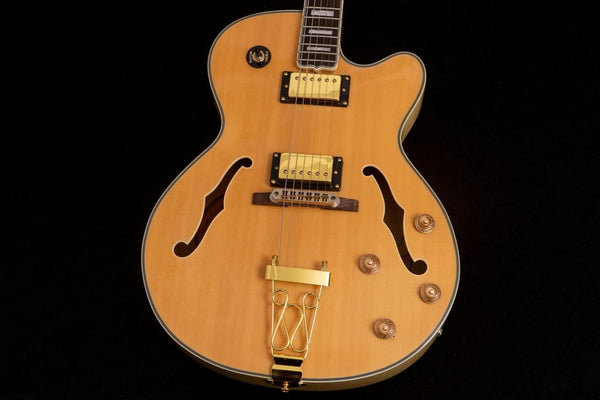 It has a gorgeous look with a hollow body with F-holes, binding on the body, neck, and headstock, and gold hardware.