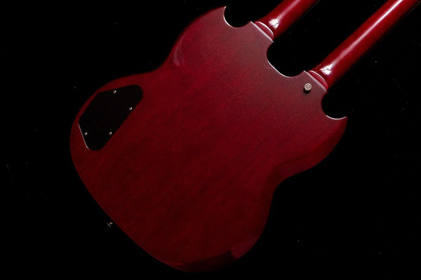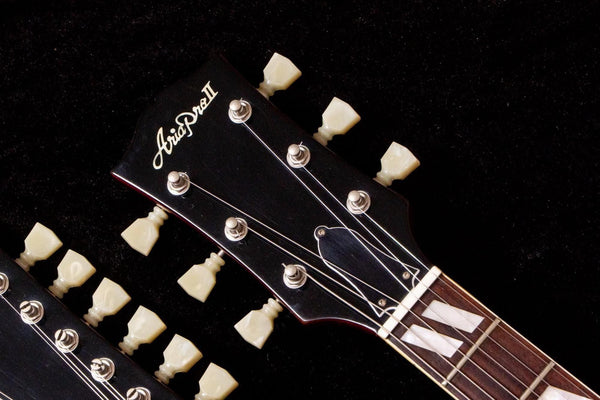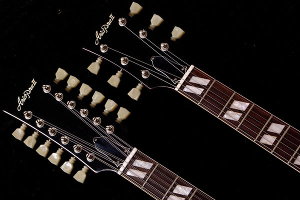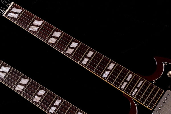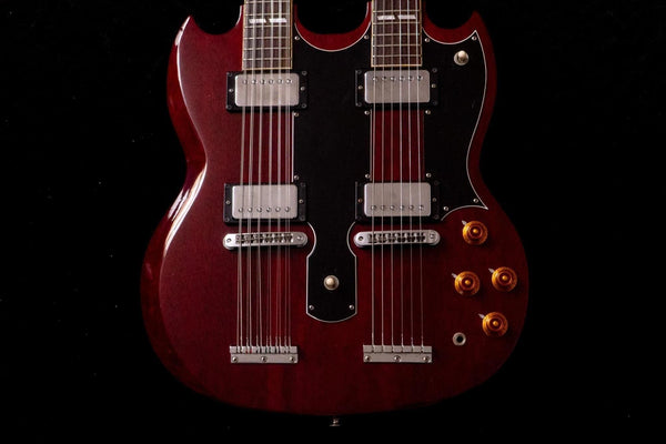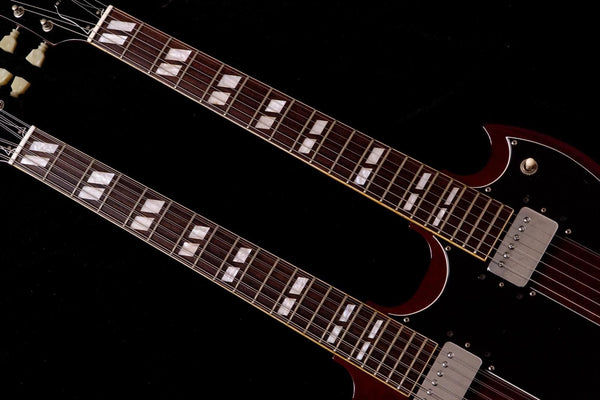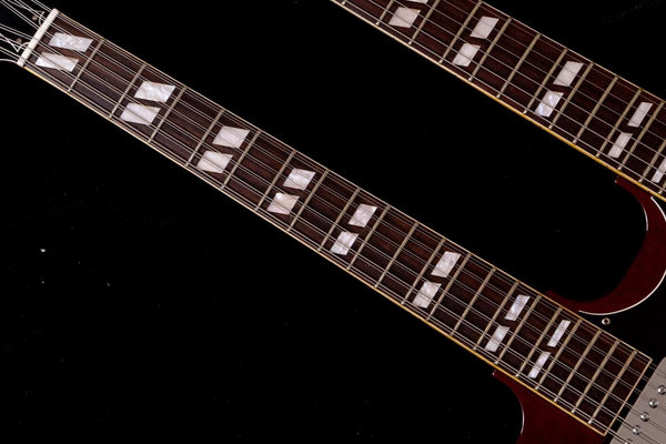 Double-neck models come in a variety of variations, such as a 6-string/4-string (bass) combination or a fretless/fretted version, but this model features the classic 6-string/12-string combination.