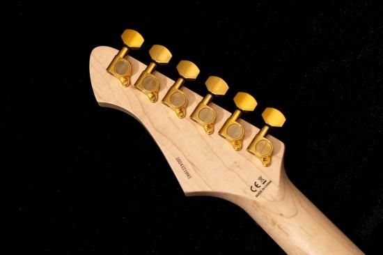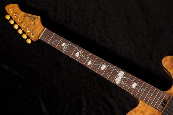 Its gorgeous looks include a natural finish that brings out the wood grain, gold hardware, fingerboard inlays, and a matching headstock.