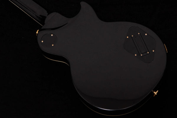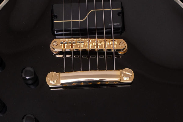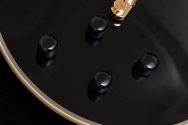 The solid black finish, fingerboard, headstock inlays, and overall binding create a luxurious look.