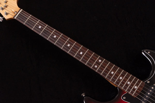 The body is alder, the neck is maple, and the fingerboard is rosewood.