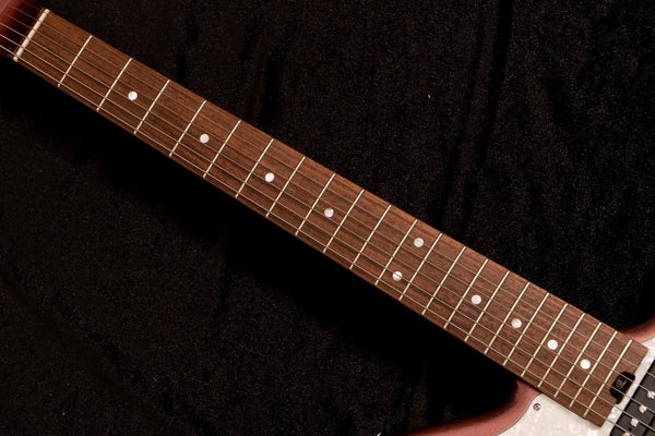 The body and finish show signs of use, and there are picking marks on the pickup cover. There is a trace of melted resin near the 1st string of the bridge, but it is usually not noticeable as it is hidden by the pickguard. There is a paint chip at the neck joint on the 6th string side of the body, and a linear scratch can be seen on the jack plate. There is also some adhesive residue sticking out from the nut.