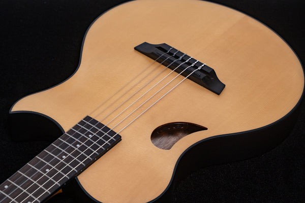 The body back uses Indonesian Mahogany, while the top features Sitka Spruce.