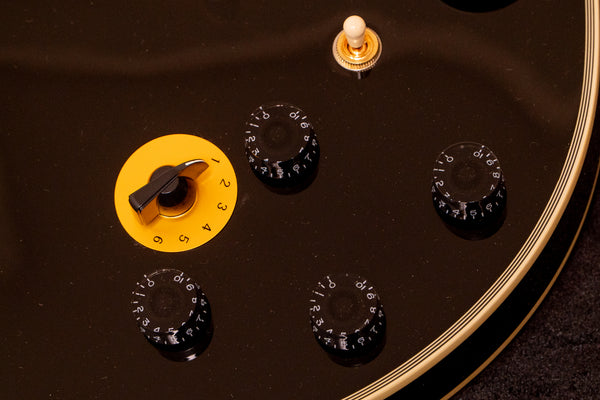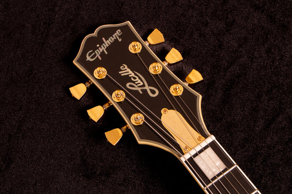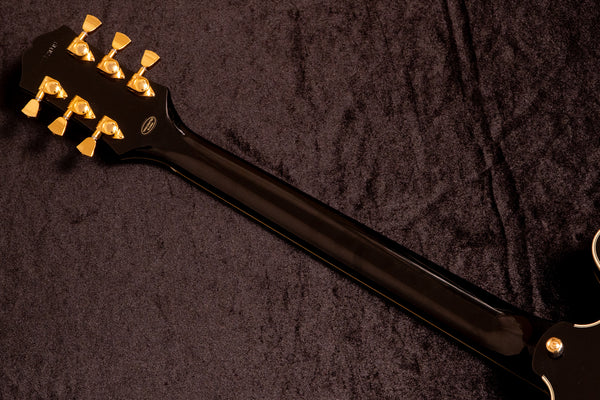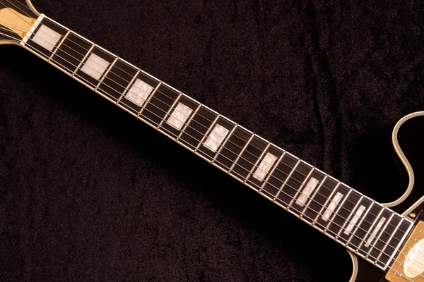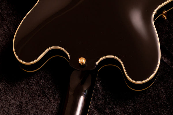 The black body, gold-toned hardware, overall binding, and block inlays on the fingerboard create an exceptionally luxurious appearance.