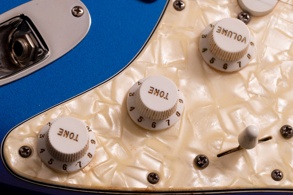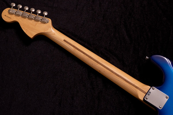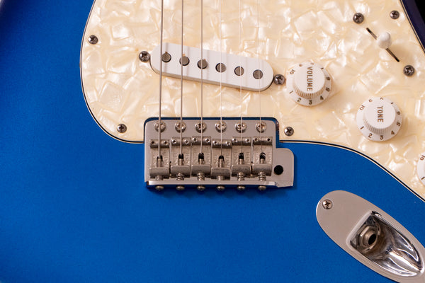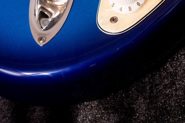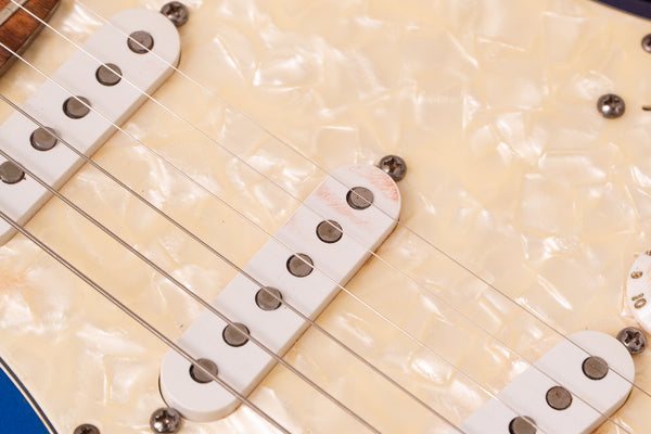 It features a beautiful Blue Burst body + pearl pickguard, a large headstock, and the signature spaghetti logo.