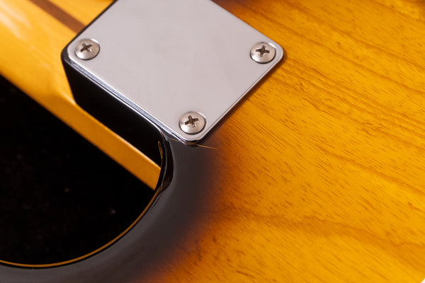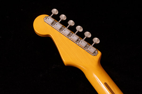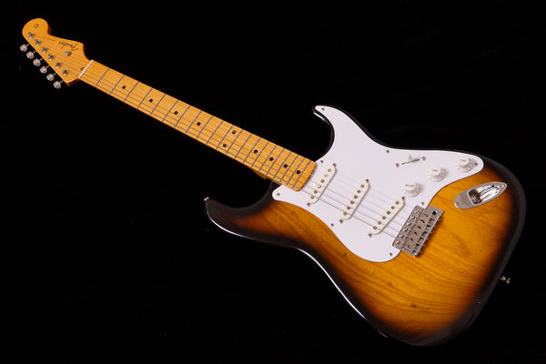 It draws inspiration from the 1954 Stratocaster, featuring a two-tone sunburst finish, a soft V-shaped neck grip, and round string guides.