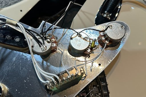 Body and finish: Scratches on the pickguard, minor dents scattered on the body back, and a small black mark near the neck plate. Overall, minor scuffs are visible, but overall wear is minimal, presenting as a very good used condition.