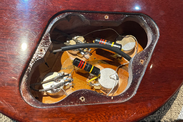 Metal parts show tarnish or rust on the tuners, Tune-O-Matic bridge, escutcheon screws, pickup screws, and jack plate screws. Green rust is visible on the selector ring.