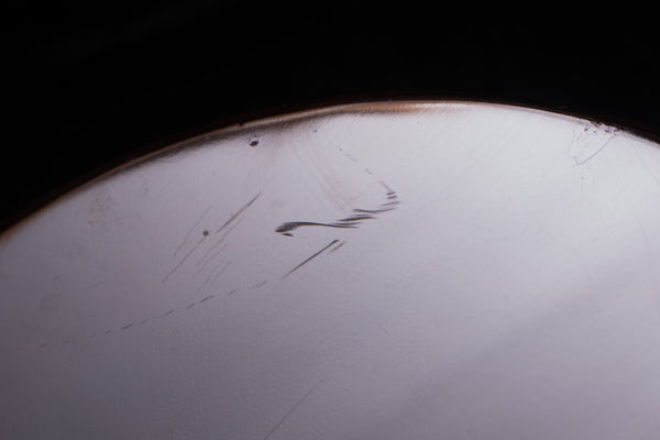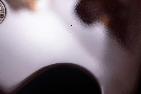The headstock has scattered scratches and small dents. The body top has faint scratches and a crack at the center between the pickups.
